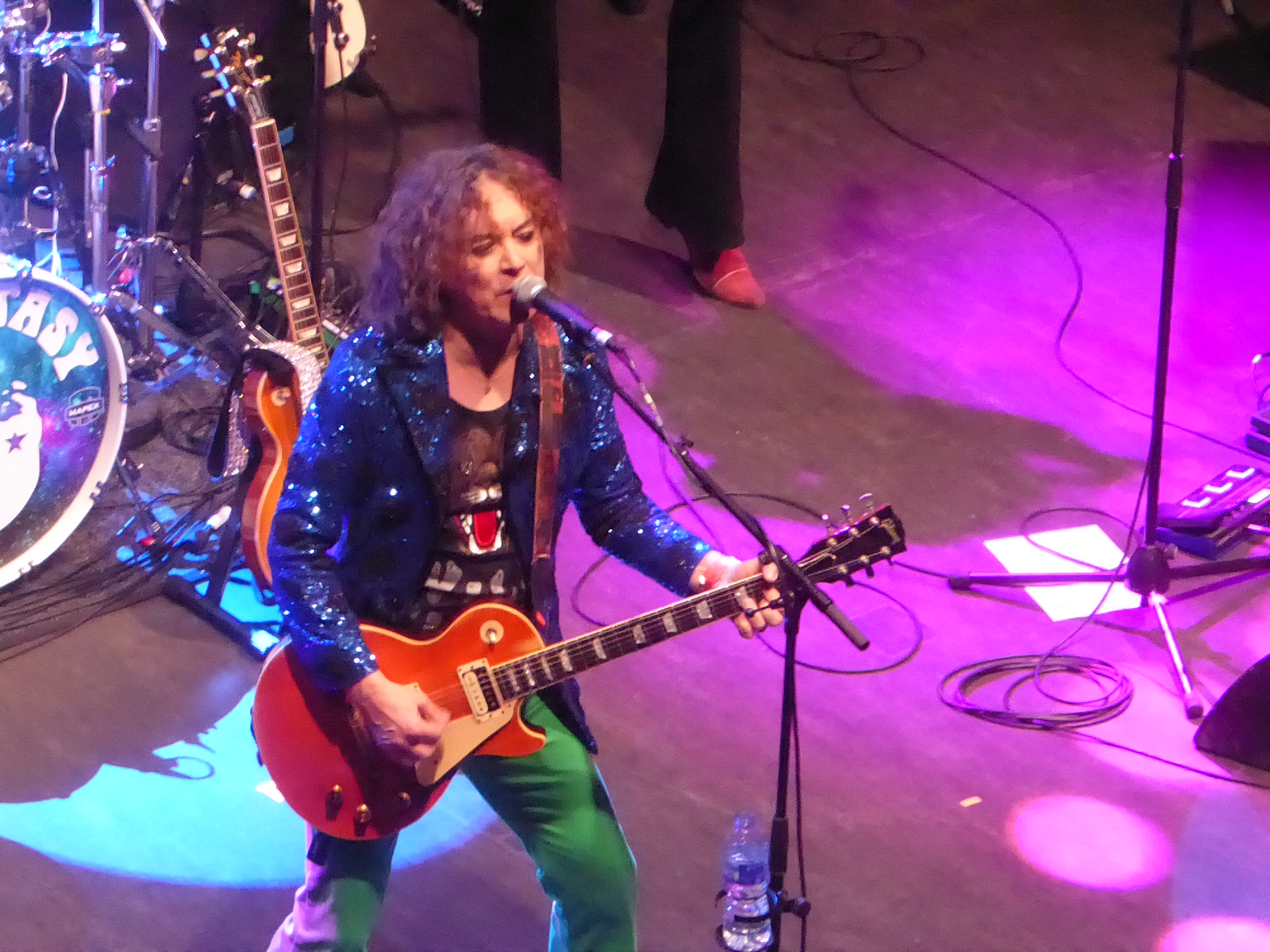He came on stage in the feather boa, spangly jacket, bold primary colours and frizzy hair of the master, though the thought occurred that it must get ever harder to carry off that youthful Bolan image that is preserved in aspic. A line up completed by a low key but very solid trio of musicians opened with ‘New York City’, and massive hits such as ‘Telegram Sam’ – where I could not resist singing along to the ‘I ain’t no square with my corkscrew hair’ lyric, ‘Metal Guru’ and ‘Children of the Revolution’ were brilliantly delivered, in a slightly rockier fashion than the originals.